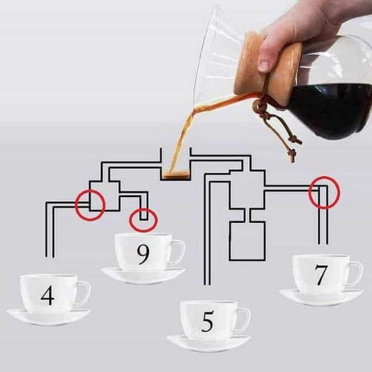„Twitter“ vartotoja Purp internete paskelbė mįslę, ragindama savo sekėjus ją išspręsti. Žiūrėdami į paveikslėlį, jie turėjo atspėti, kuris puodelis pirmas prisipildys kavos. Keista, bet skaitytojai nesutiko ir pateikė skirtingus atsakymus. Vieni teigė, kad tai 5-asis puodelis, kiti – 9-asis, o treti bandė sudėlioti puodelius eilės tvarka, surasdami 4, 9, 5, 7 arba 4, 9, 7, 5. Ar galite rasti vienintelį teisingą atsakymą?