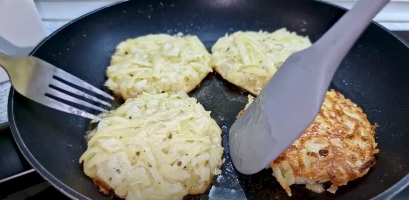 Mes sujungiame bulvių masę su svogūnais, juodaisiais maltais pipirais, druska, kiaušiniu ir miltais, kruopščiai sumaišykite. Keptuvėje šildome augalinį aliejų, išdėliokite ant paviršiaus pagal šaukštą bulvių masės.