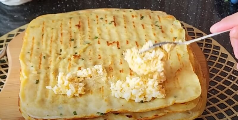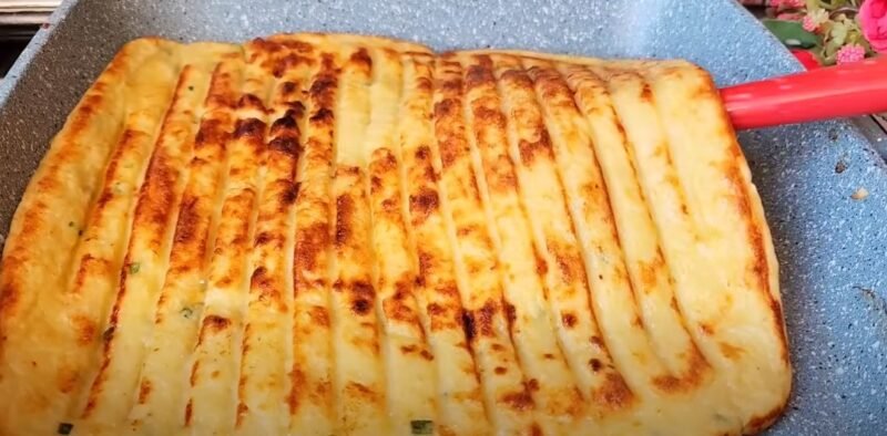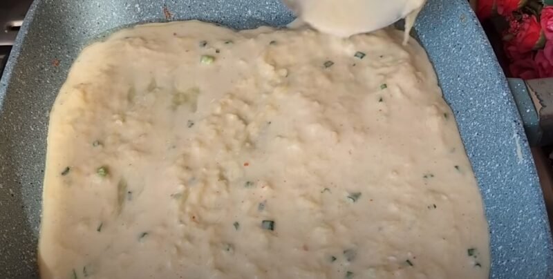 Valgykite smulkiai žalius svogūnus, supilkite į tešlą. Keptuvė sutepta augaliniu aliejumi, ją pašildo. Mes uždedame ploną tešlos sluoksnį ant keptuvės dugno, kepame po dangčiu iš abiejų pusių į auksinę plutą.