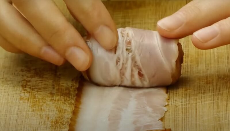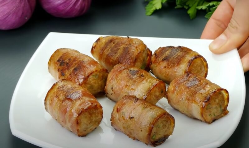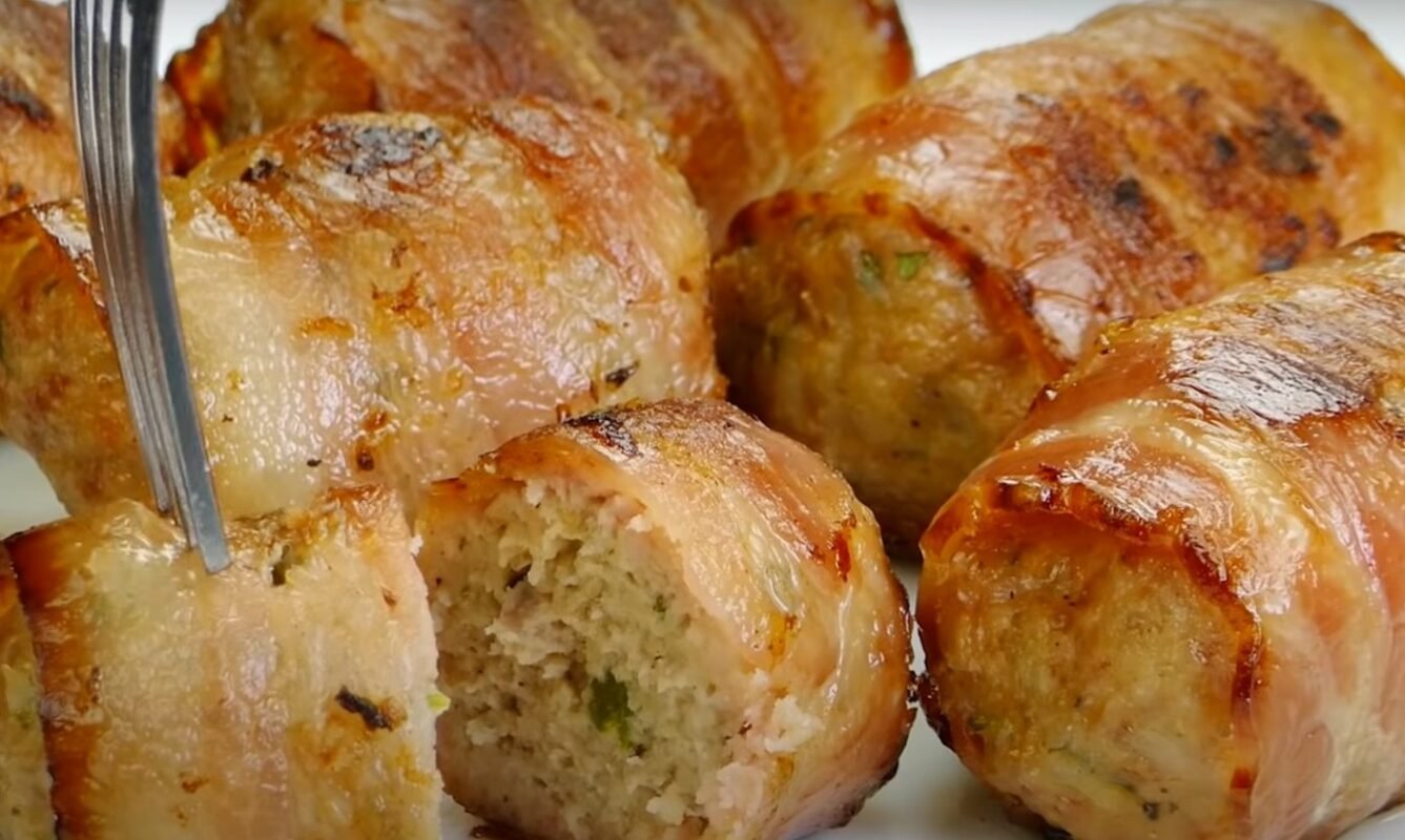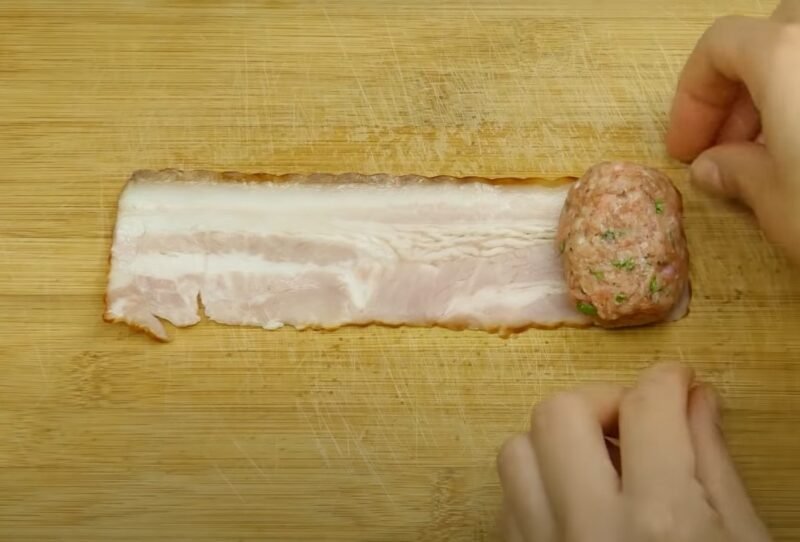 Suformuokite pakankamai mažų mėsos kukulių. Kiekvienas kukulis yra suvyniotas į šoninės gabalėlį.