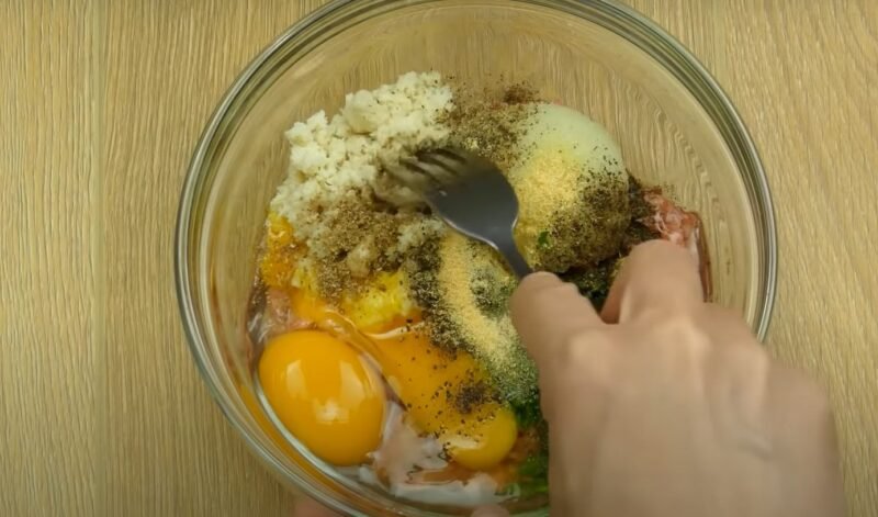 Mėsos masėje mes pridedame svogūnų, garstyčių, žalumynų, juodųjų maltų pipirų, druskos, kalendros, susmulkintų česnakų ir kiaušinių, visi kruopščiai išmaišykite.