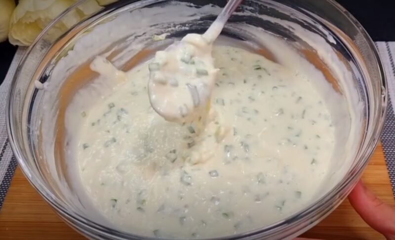Dubenyje sudėti kiaušinį, pieną, kefyrą, sviestą ir druską. Visi ingredientai yra kruopščiai maišomi su corolla.