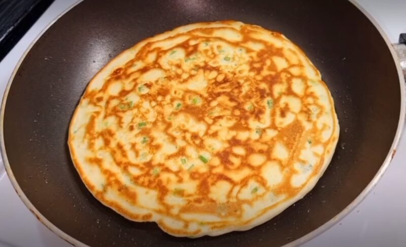 Sutepame šildomą keptuvę augaliniu aliejumi, tešlą sudėkite nedideliu sluoksniu ant paviršiaus, visiškai uždengiame keptuves.