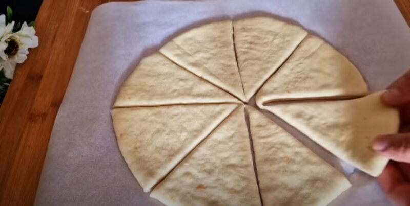 Tešla padalinta į dvi lygias dalis, išvyniojama stori (cm) apvalūs sluoksniai. Įtūžę pyragai turi būti suskirstyti į 8 trikampius kaip pica.