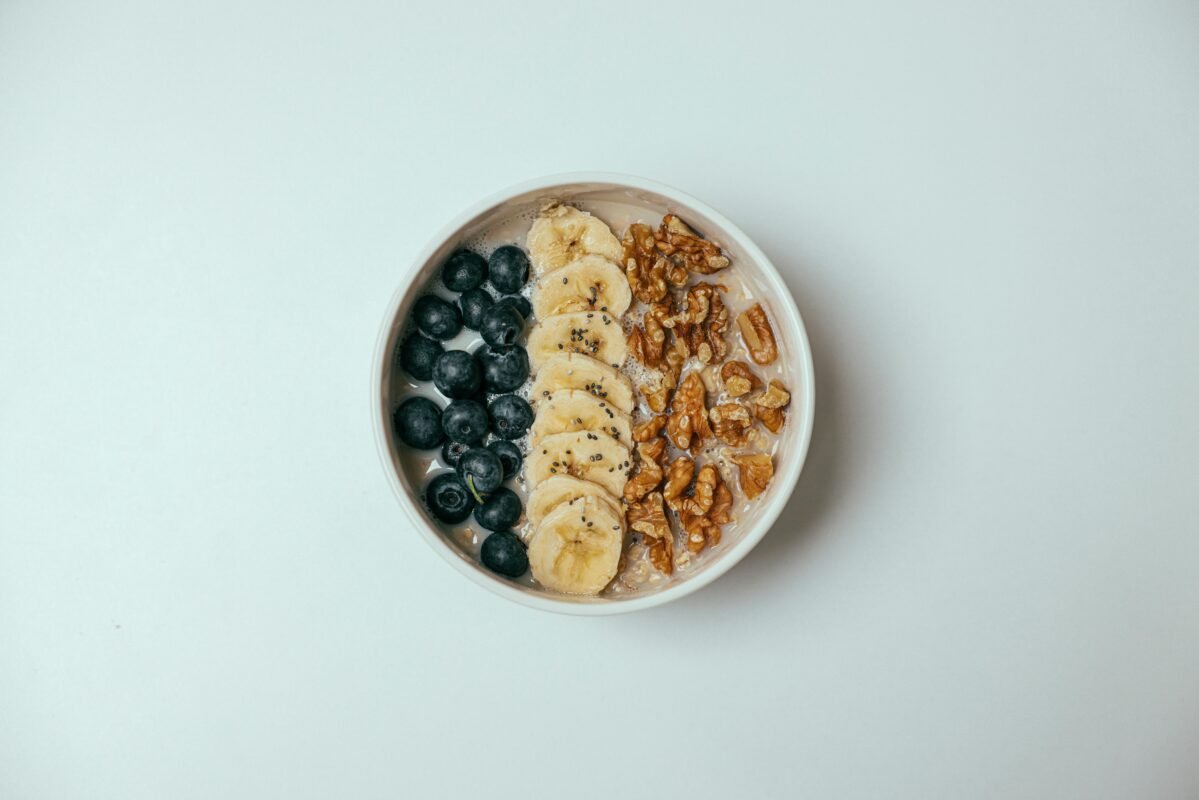 - Ant viršaus dėkite bananus, riešutus, cinamoną, jei norite – šaukštelį medaus.
