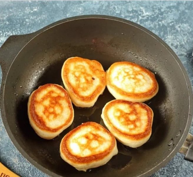Kefyras turėtų būti šiek tiek šildomas, o tai leis jums gauti tešlą, kuri tolygiai pakils ir gerai iškeps. Kuo daugiau lydymo, tuo skanesnis ir daugiau bagažo, tuo mažiau aliejaus reikia juos skrudinti, nes pati tešla bus riebi.