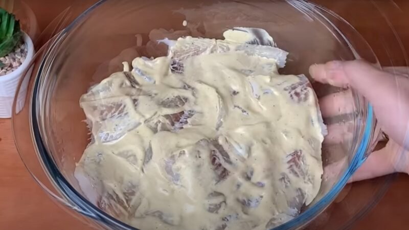 Marinatui reikia sumaišyti grietinę su sojos padažu, garstyčiomis, juodaisiais maltais pipirais ir druska. Šis marinatas turi apimti visus žuvų gabalus.