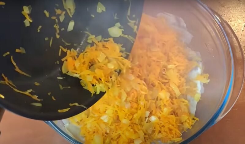 Morkos sumalamos ant smulkios trintuvės, supjaustykite svogūnus mažu kubeliu. Keptuvėje su nedideliu aliejaus pridėjimu mes kepame morkas ir svogūnus iki minkštumo.