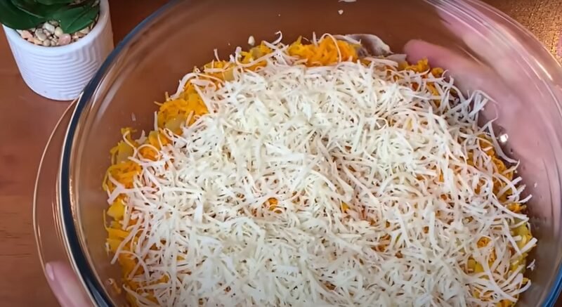 Ant grotelių iš anksto įkaitinti būtina patrinti sūrį. Ant daržovių sluoksnio uždėkite sūrio dangtelį.