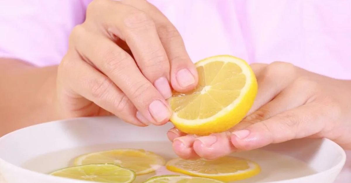Perpjaukite citriną per pusę ir 10 minučių pamirkykite pirštų galiukus minkštime. Tada abi puses suvyniokite į foliją ir laikykite šaldytuve. Šią citriną galite naudoti kiekvieną dieną savaitę. Nagus citrinų vandenyje mirkykite kas antrą dieną dvi savaites. Citrinų rūgštis naudinga odelei ir pačiam nagui.