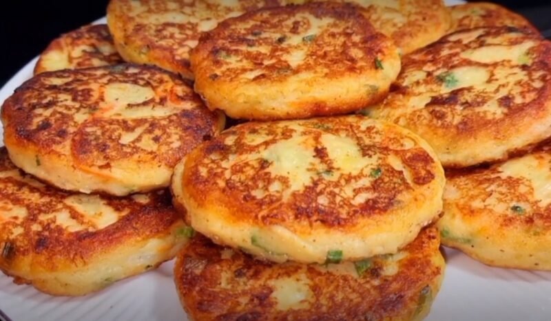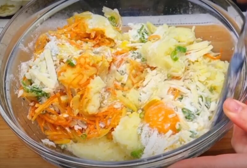 Šiuo metu patrinkite sūrį ant didelės trintuvo, supjaustykite žaliuosius svogūnus. Bulvės paverčiamos bulvių koše, išdėstomos ant morkų, susmulkinto sūrio ir žaliųjų svogūnų.