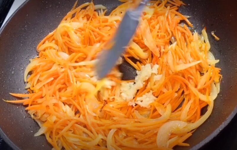 Kepkite svogūnus su augaliniu aliejumi keptuvėje iki minkštumo. Įpilkite morkų į svogūną, mes ir toliau kepame.