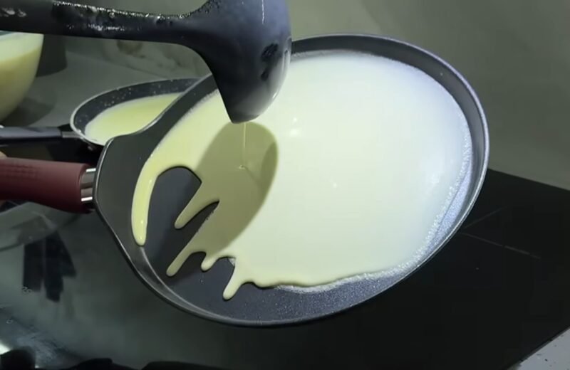 Palaipsniui į tešlą įpilkite pieno likučių ir augalinio aliejaus. Kuo riebesnis pienas, tuo skanesni blynai.