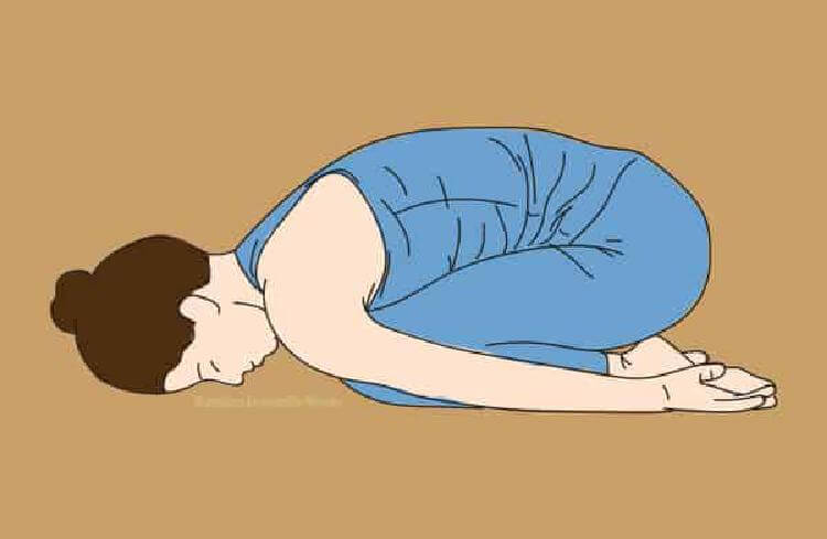 Atsiklaupkite ant žemės pečių plotyje, rankas uždėdami už kūno. Lėtai pasilenkite į priekį, visiškai nuleisdami galvą. Išlikite šioje atsipalaidavusioje pozoje 3–4 minutes, darydami pertraukas tarp gilių, tolygių įkvėpimų ir iškvėpimų, ir pajuskite, kaip atsipalaiduoja jūsų nugara.