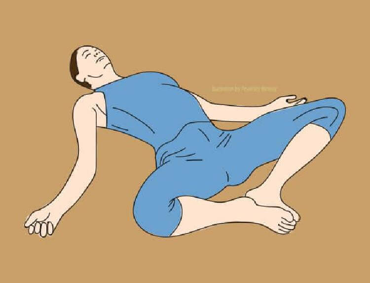 Atsigulkite ant nugaros plačiai išskėstomis rankomis. Dešinį kelį priglauskite prie krūtinės. Tada pasukite visą liemenį į kairę, laikydami nugarą tiesiai. Išlaikykite šią poziciją apie 3 minutes, tada pakartokite su kita puse. Ši poza labai naudinga visiems, kurie dažnai jaučia nugaros skausmus uodegikaulio srityje.