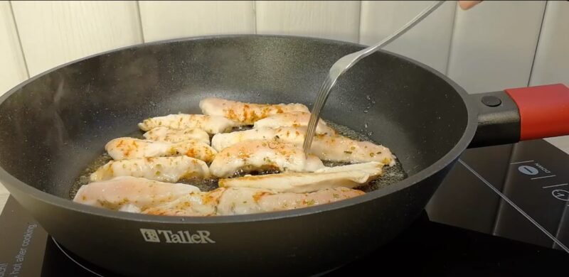 Vištienos krūtinėlę supjaustykite gana dideliu šiaudeliu, pabarstykite druska, juodaisiais pipirais ir paprika. Kepkite vištienos šiaudelį iš abiejų pusių į skaistalų plutą apie 2-3 minutes.