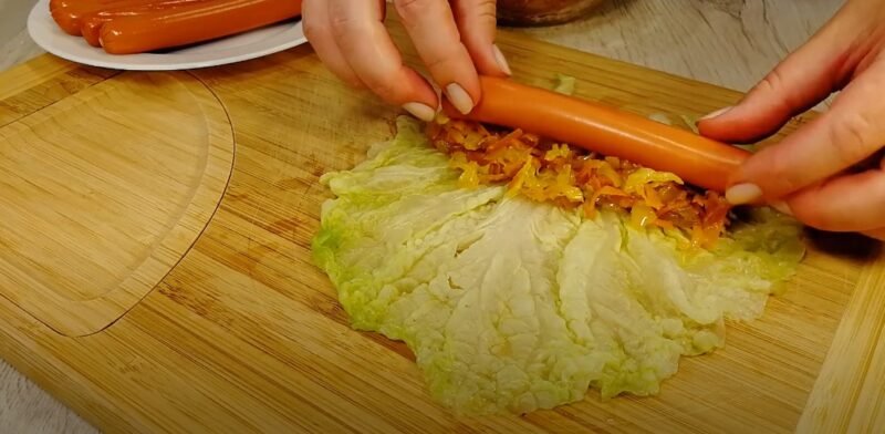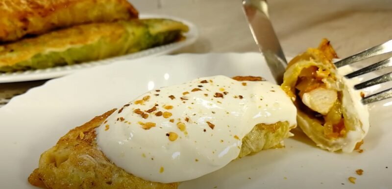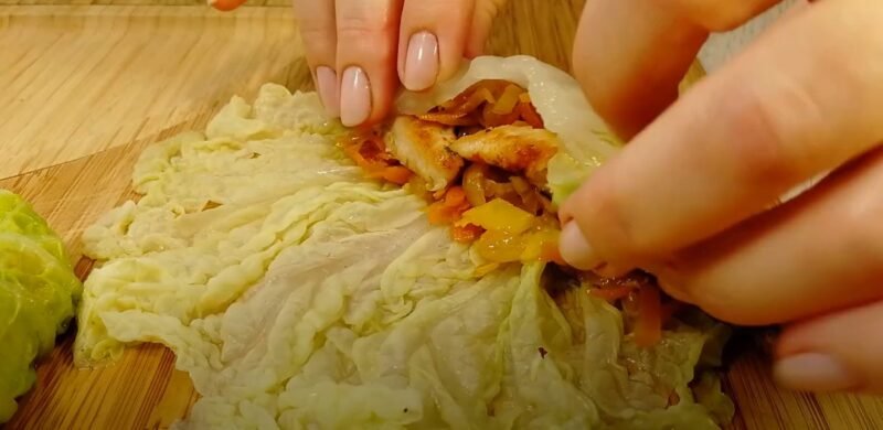 Ant kopūstų lapų mes išdėliojame keptas daržoves, o ant viršaus įdedame vištienos šiaudelius. Suvyniokite kopūstų lapų ingredientus.