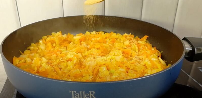 Supjaustykite svogūną su vidutiniais kubeliais, morkos patrinkite ant didelės trintuvės. Keptuvėje, suteptoje augaliniu aliejumi, pirmiausia išdėliojame svogūnus. Po to, kai svogūnai šiek tiek skrudinami, įpilkite morkų. Mes ir toliau kepame daržoves vidutiniškai 2-3 minutes.