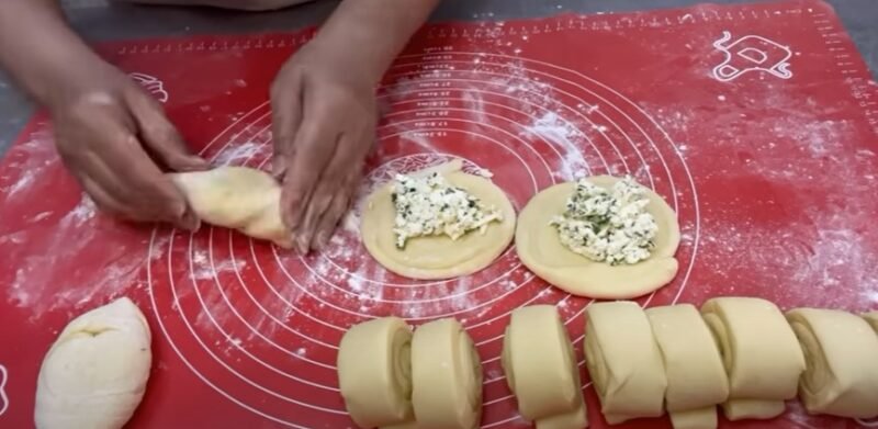Sluoksnis sustoja į ritinį, tada padalinamas į 12 identiškų dalių. Kiekvienas ritininis ritinys mažame pyrage, kur mes įdėjome įdarą, mes sumalame kraštus.