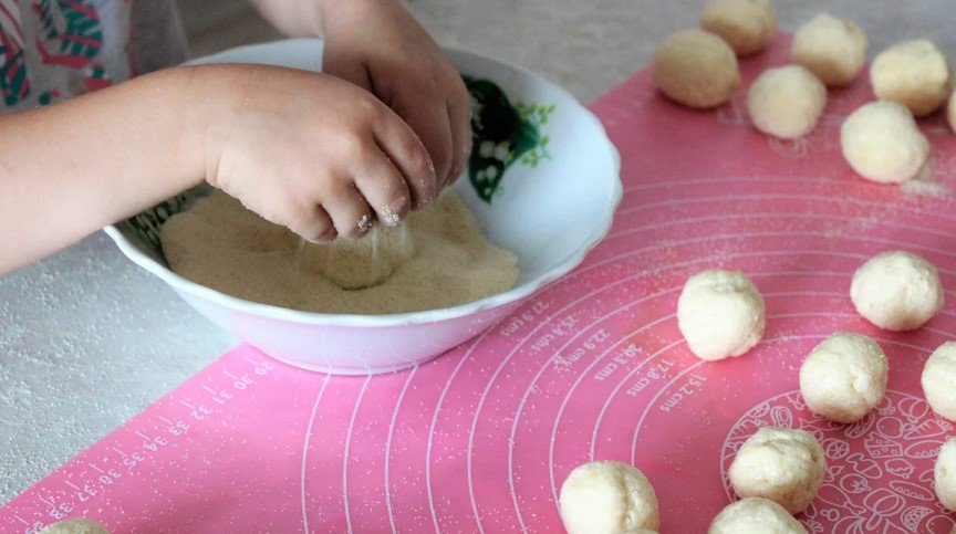 Dabar visi rutuliai turi būti suvynioti į manką, aš pasitikiu šiuo atveju mano pagrindiniam asistentui virtuvėje – dukrai. Ji puikiai dirba, ir aš vis dar turiu laiko pašalinti nešvarius indus nuo stalo.