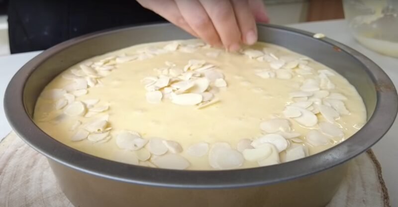 Prieš kepdami paskutinį sluoksnį, galite įdėti migdolų trupinius ant paviršiaus ir po virimo, apibarstytą cukraus trupiniais.