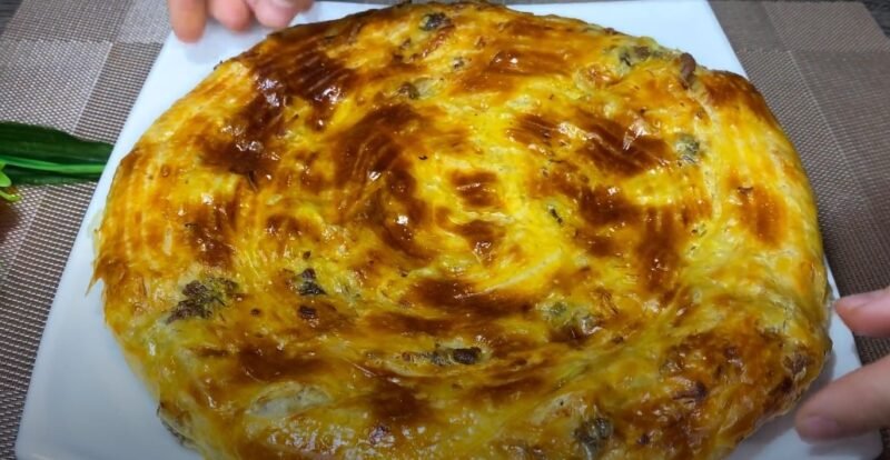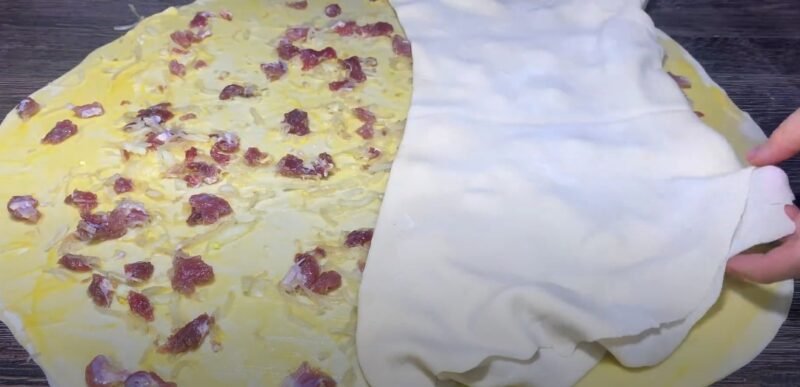 Tešla yra padalinta į 4 identiškas dalis, kiekviena atskirai suvyniota į didelį apvalų ploną sluoksnį. Du sluoksniai sutepami lydytu sviestu, dalį įdaro paskleiskite iš mėsos ir svogūnų.