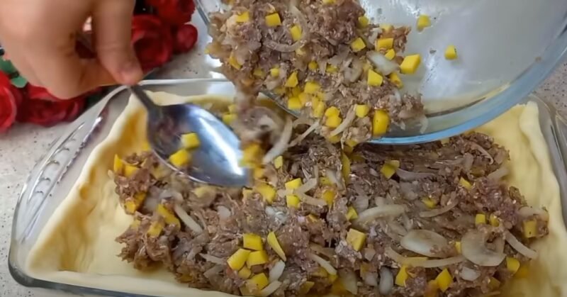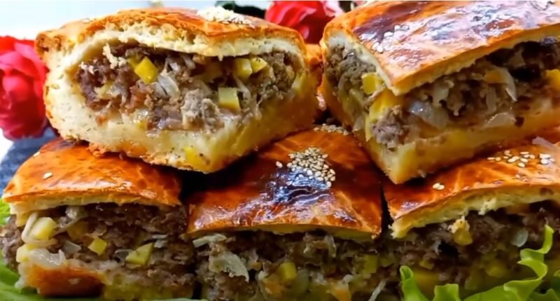 Pasirodo, gražus skaistalų pyragas su mėsos įdaru. Šis kvapnus patiekalas bus pagrindinis šventinio stalo patiekalas.