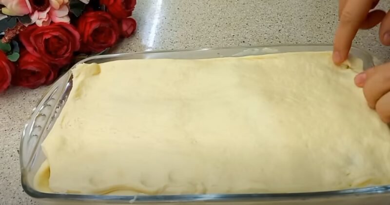 Tešla yra padalinta į dvi lygias dalis, viena iš jų sustoja į stačiakampį sluoksnį, kurio storis 1,5 cm. Įdėkite sluoksnį į kepimo formą, suteptą sviestu.