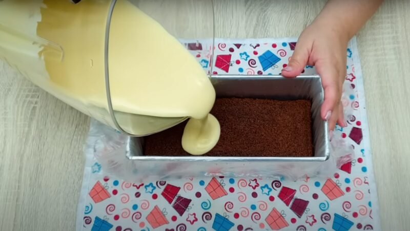 Mes uždengiame švarią formą celofanu, perkeliame vieną iš trupinių į apačią. Ant torto supilti baltojo šokolado įdarą, uždenkite antru pyragu.