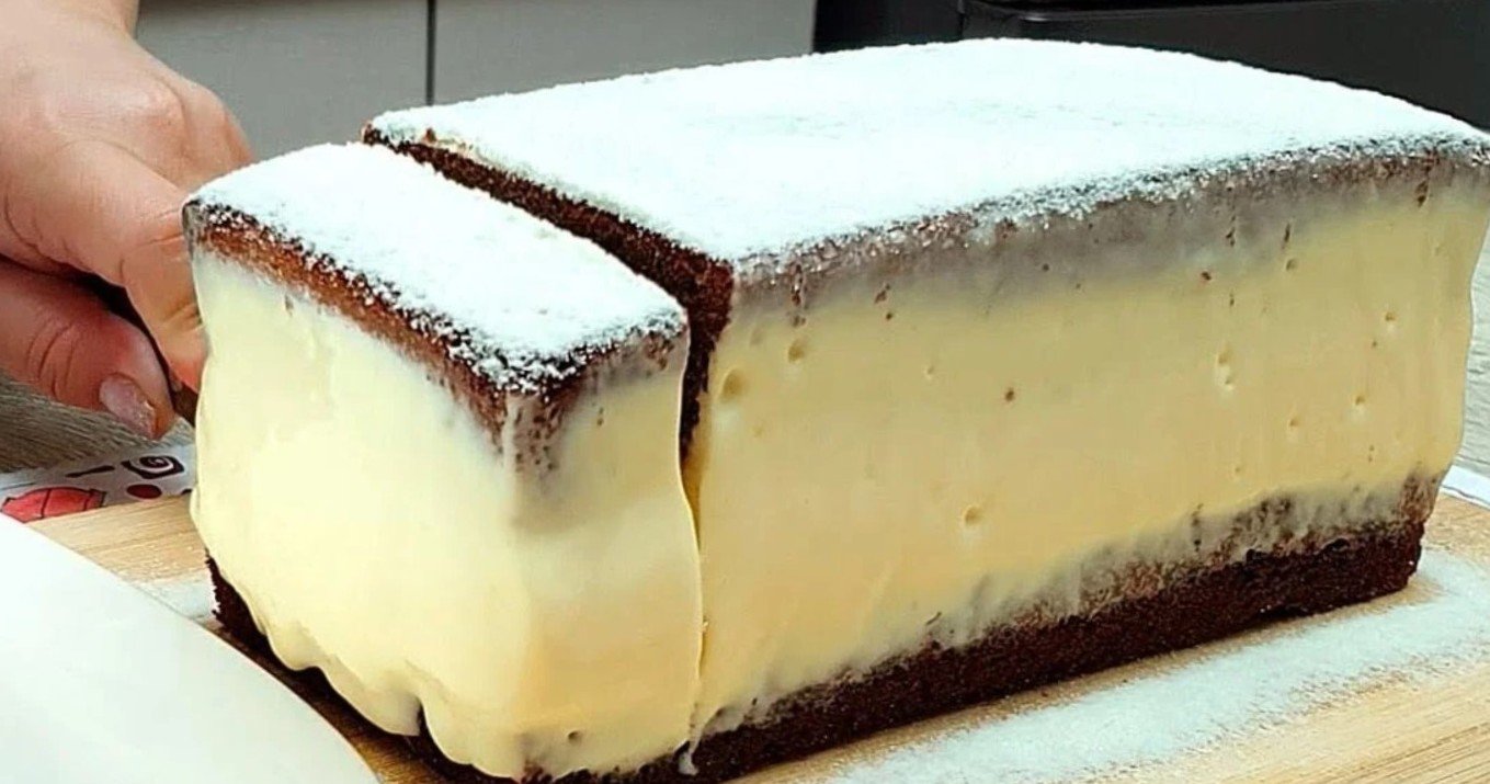 Ištaisę pyragą, mes gauname desertą su dideliu saldaus įdaro sluoksniu. Prieš patiekiant galite pabarstyti pyragą su miltelių pavidalo arba sausu pienu.
