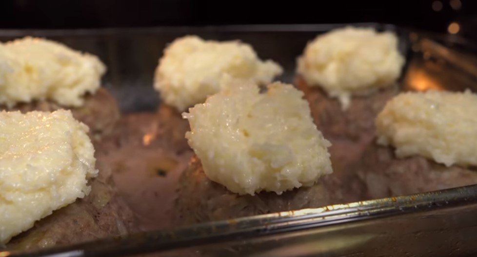 Likus 10 minučių iki kepimo pabaigos, išdėliokite masę kiekvienam kotletui ir kepkite 10 minučių be folijos.
