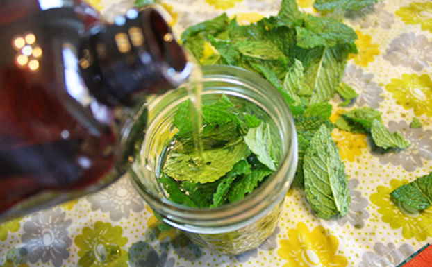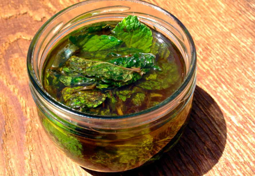 Po to į šį dar labai šiltą aliejų suberkite susmulkintą mėtą. Vienam litrui aliejaus naudokite pusantros puodelio džiovintų mėtų (dvi su puse puodelio šviežių mėtų). Sandariai uždarykite stiklainį ir leiskite jam pritraukti šiltoje vietoje. Po dviejų savaičių išspauskite aliejų ir laikykite vėsioje, tamsioje vietoje.
