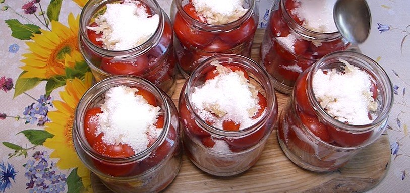 Pomidorus pilame verdančiu vandeniu, uždengiame dangčius ir paliekame 30 minučių.