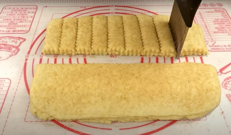 Supilkite tešlą, pabarstykite cukrumi ir padalinkite į du stačiakampius. Kiekvienas stačiakampis yra padalintas į mažas dalis.