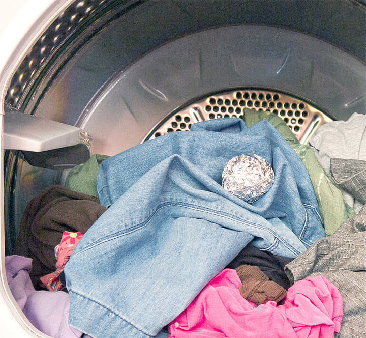 Tikriausiai žinote, kad aliuminis sumažina statinę elektrą ir taip padidina skalbiklio efektyvumą.  Tiesiog susukite sandariai supakuotus folijos rutuliukus ir įdėkite juos į būgną kartu su kitu skalbinių kiekiu.