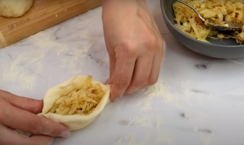 Jei pageidaujama, įdaras sūdomas ir ištirpinamas sviesto gabalas į kopūstų masę. Kol užpildas atvėsta, reikia paruošti tešlą.