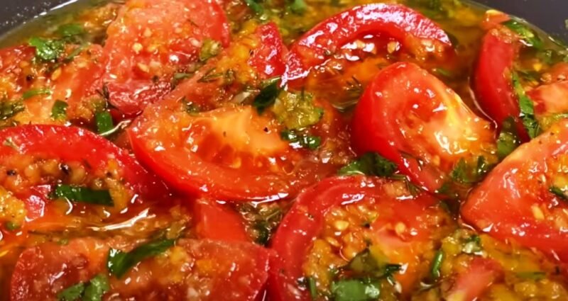 Rezultatas yra puikus pomidorų užkandis. Šį užkandį galima vartoti atskirai arba į salotas.
