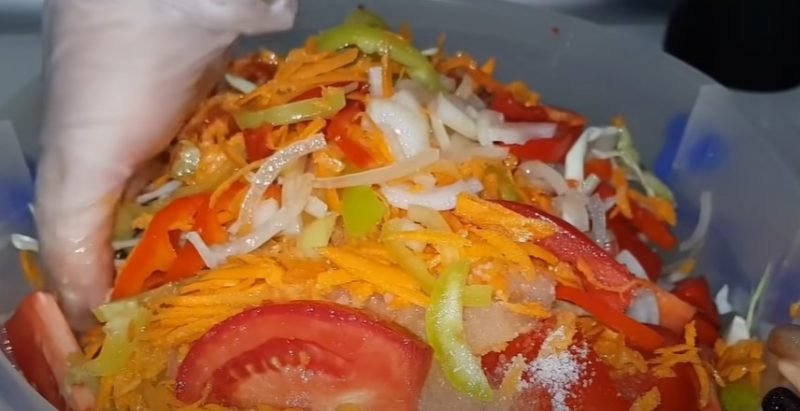 Kasuta plonai susmulkinama, supjaustoma svogūnu su plonais pusiau žiedais, saldžiaisiais pipirais – šiaudeliais, pomidorais su griežinėliais. Morkos trys ant didelės trintuvo arba Korėjos morkų.