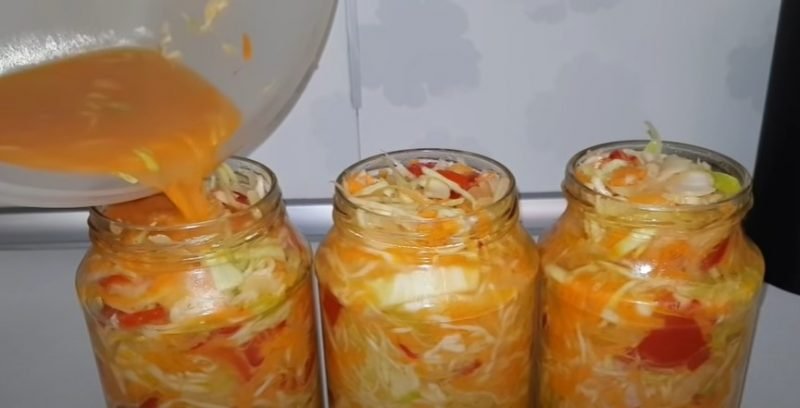 Mes išdėliojame salotas stiklainiuose, šiek tiek trampame ir supilame sultis, uždengiame dangtelius.