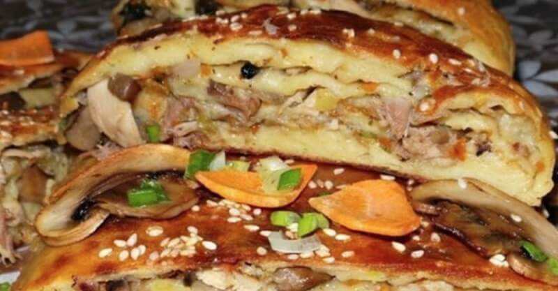 - Tuo tarpu vištiena paruošta. Vištienos filė supjaustykite mažais kubeliais ir sudėkite į svogūną, morkas ir grybus. Viską sumaišykite ir įberkite žolelių pagal skonį, druskos ir juodųjų pipirų. Įdaras paruoštas.