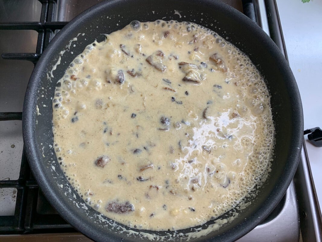 Sudėti grietinę, šiek tiek vandens, jei norite, kad padažas būtų storesnis, grybų skrudinimo etape, supilti miltus, tada išpilti grietinę ir vandenį. Druska pagal skonį