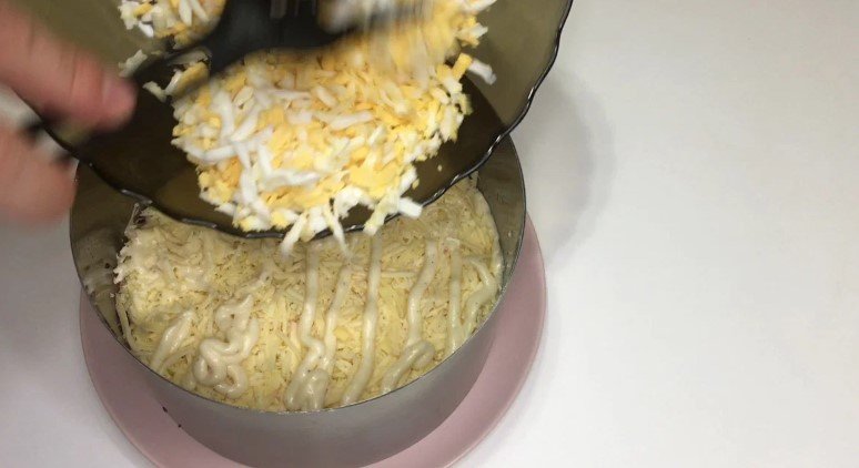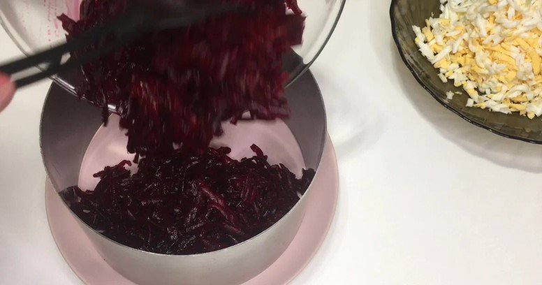 Nuimamas žiedas yra suteptas augaliniu aliejumi, ant dugno uždėkite runkelių masę, suteptą majonezo padažu. Sumaišykite smulkiai sūrį, išdėliokite 1⁄2 dalies su antruoju sluoksniu žiede, taip pat sutepkite majonezu.
