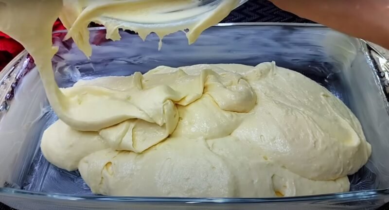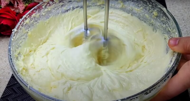 Kiaušinių putose pirmiausia supilame augalinį aliejų, toliau plakame, o po to grietinę. Sumaišius visus ingredientus, reikia persijoti į miltų mišinį.